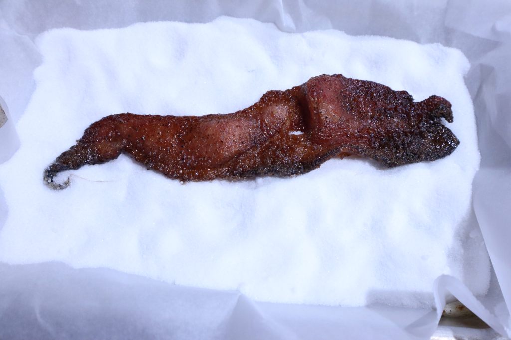 For my oven, I pull the bacon out at 28 minutes from the middle rack. If the strips are tossed in the white sugar without cooling, the sugar will melt instead of coat the bacon. Personally, I’m adding extra pepper but I don’t recommend it to the public I’m just a pepper fiend. Freshly cracked pepper would be great here. Also, you can reserve the bacon drippings from the pan it is delicious.