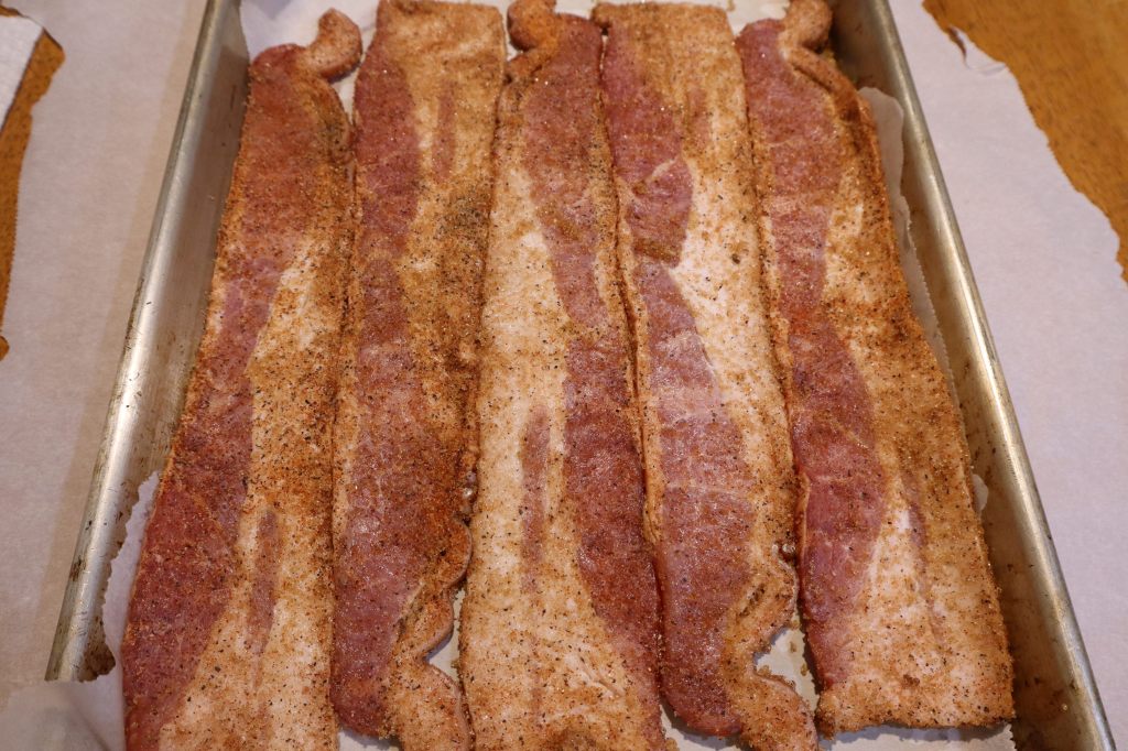 1. Preheat the oven for 400°F (204°C). Line a sheet tray with parchment paper large enough to fit five strips of bacon. It is fine if they are slightly touching when raw because they’ll shrink.