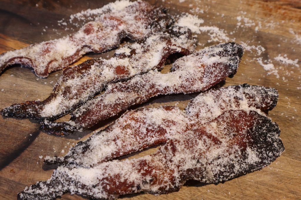 Storage: In an air tight container consume the candied bacon within 4 months stored in the freezer or 3 days stored in the fridge.