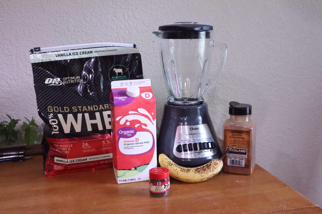 1: Prepare ingredients: Add all of the ingredients to the blender in order of softest to hardest: the milk, cinnamon, powder, clove, and banana. It would be beneficial to slice the banana into fourths, but it is not necessary.